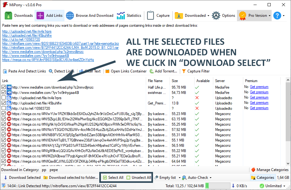Las descargas se pueden guardar en diferentes carpetas creadas por el usuario antes que se descarguen para tenerlas más controladas. Así, un grupo de archivos se pueden seleccionar en la pestaña de “Añadir enlaces” y haciendo click en “Descargar seleccionados en carpeta” elegir una carpeta para que se guarden ahí cuando sean descargados dichos archivos. De esta forma podemos tener más ordenadas las descargas.